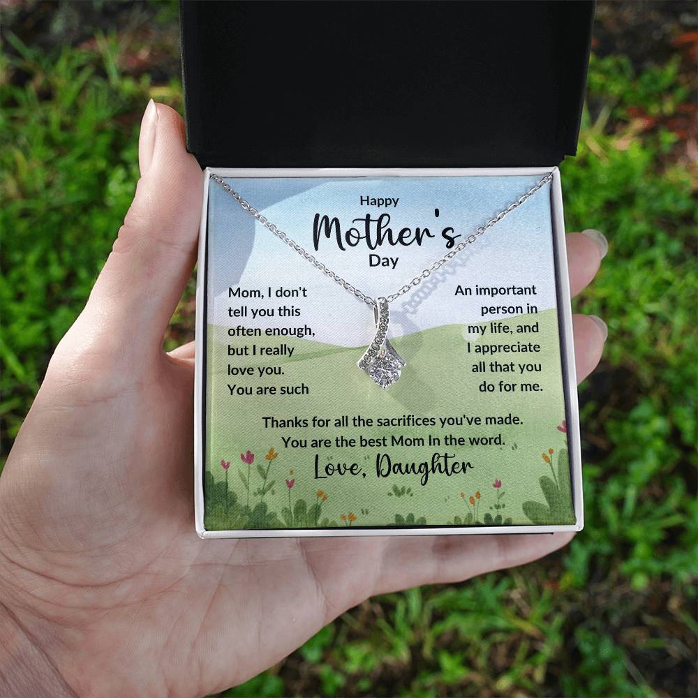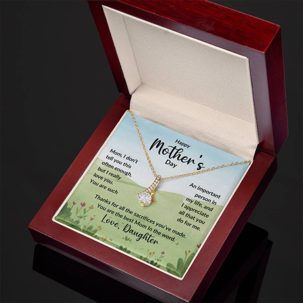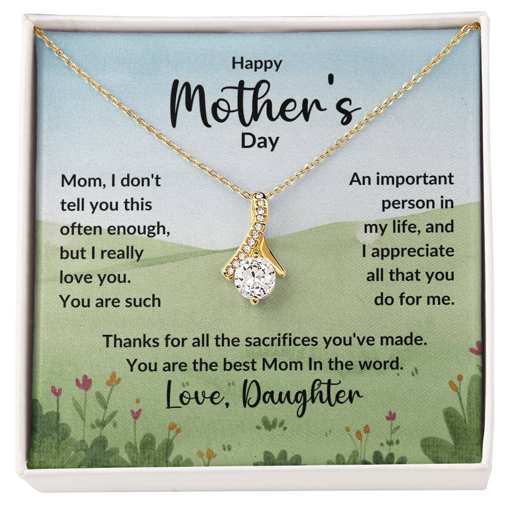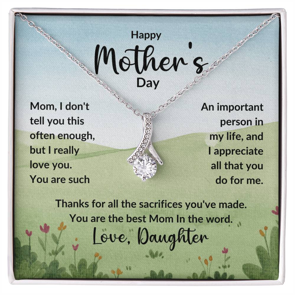 Mom, I don't tell you this often enough, but I really love you. You are such An important person in my life, and I appreciate all that you do for me. Thanks for all the sacrifices you've made. You are the best Mom In the word. Love, Daughter