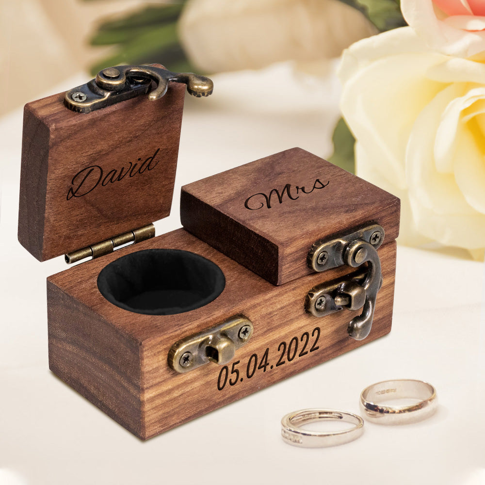 This wooden ring box is designed specifically for proposals, engagements, and storing rings. Made from high-quality wood, it boasts a beautiful surface that adds to its elegance. The box is spacious enough to fit multiple rings and can be personalized with a unique name to make it a one-of-a-kind keepsake for your future memories.