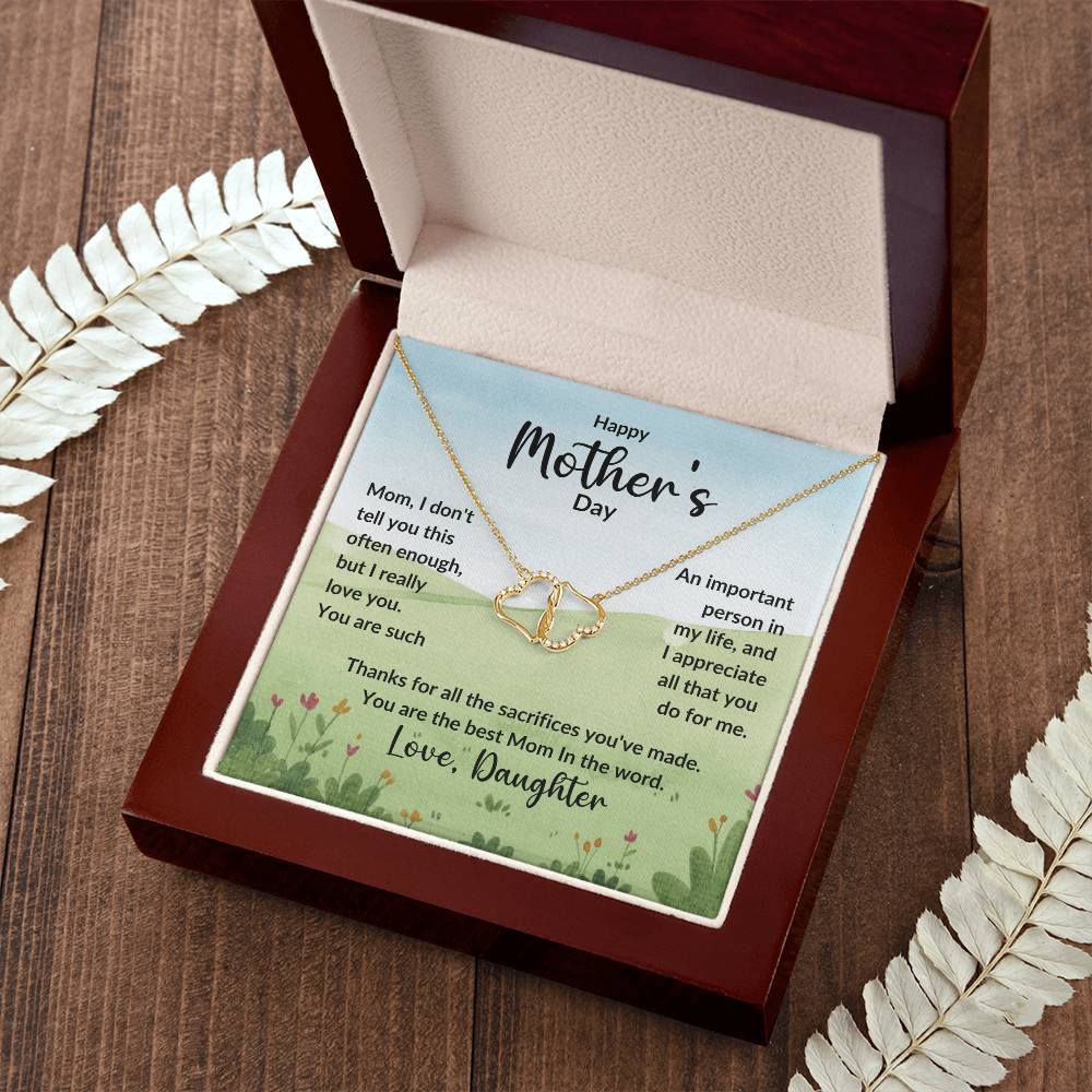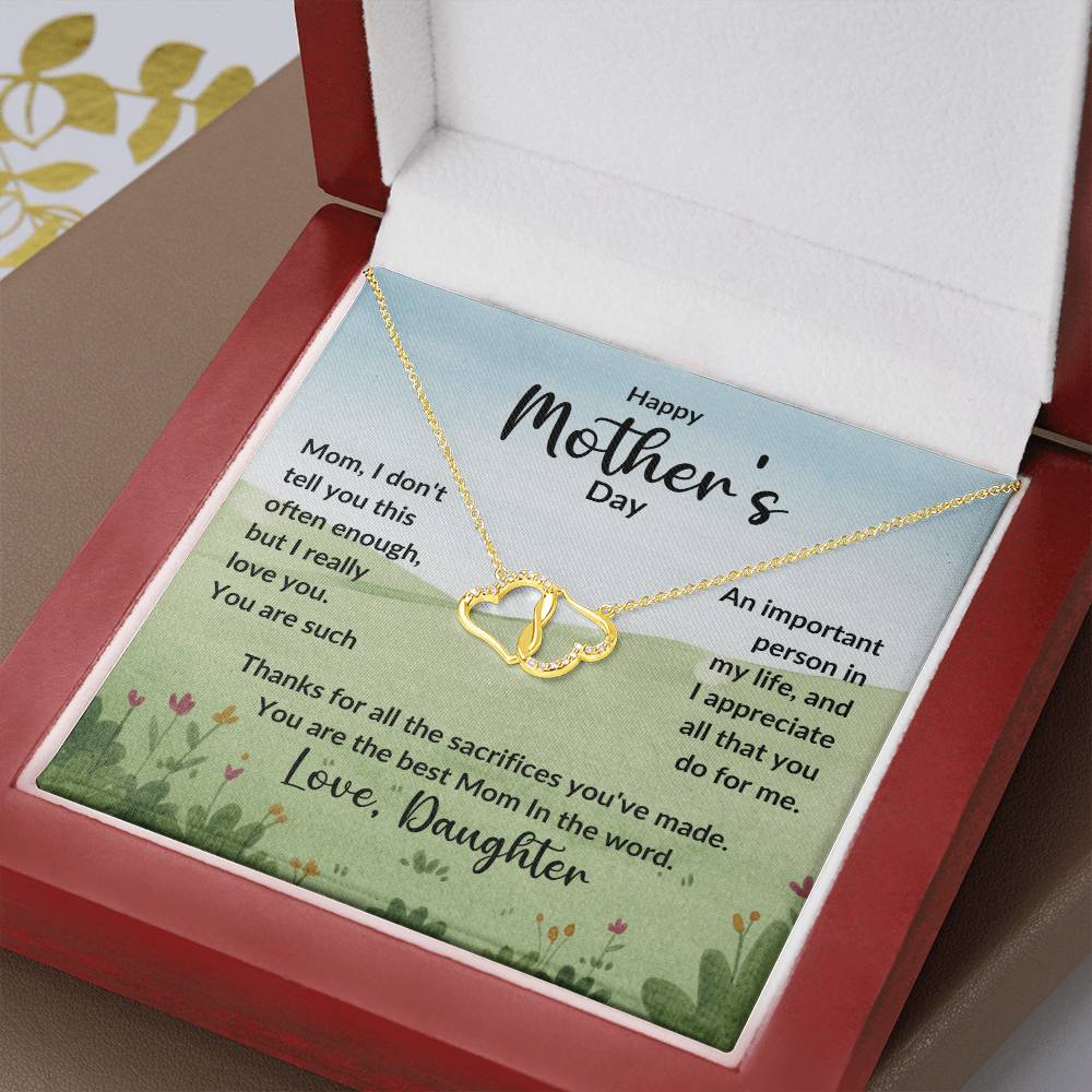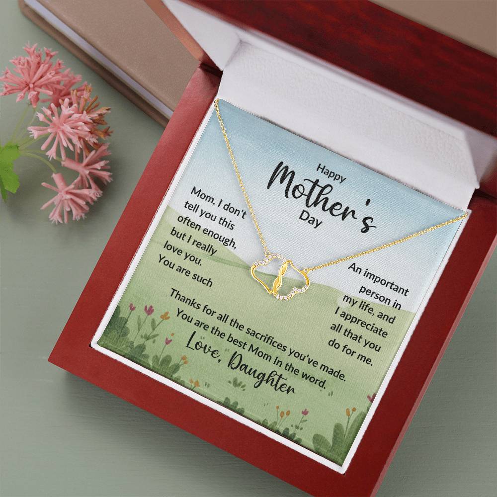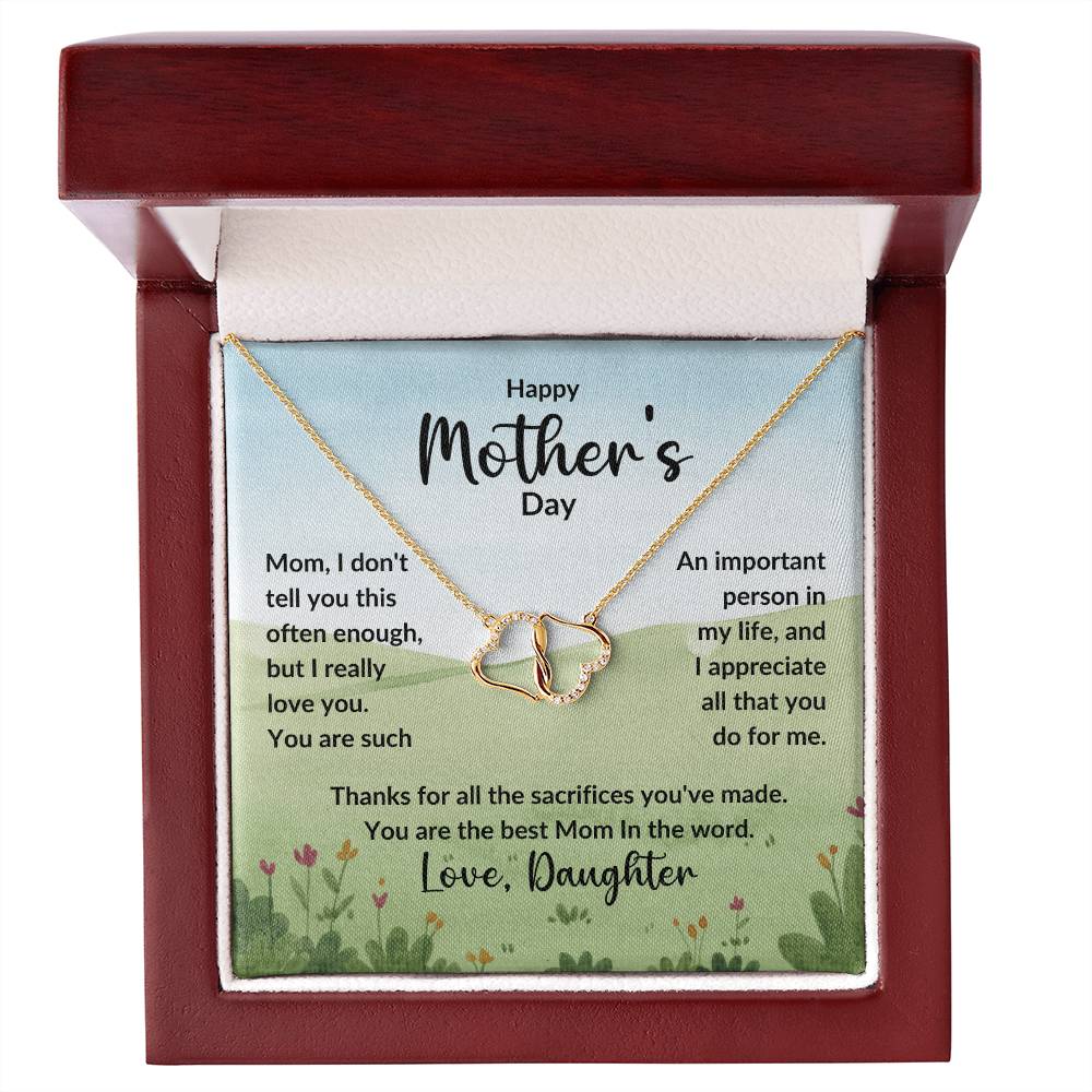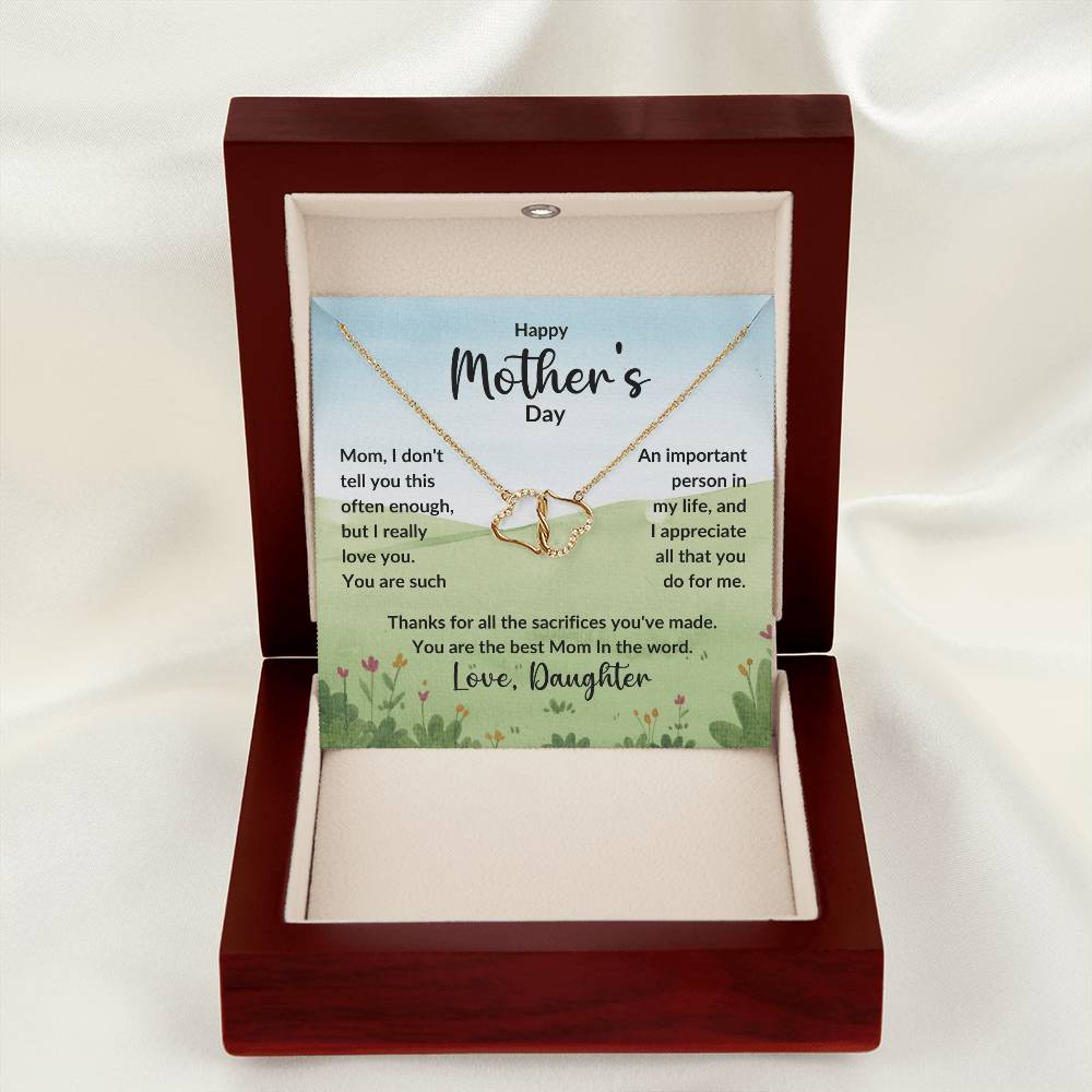 Mom, I don't tell you this often enough, but I really love you. You are such An important person in my life, and I appreciate all that you do for me. Thanks for all the sacrifices you've made. You are the best Mom In the word. Love, Daughter