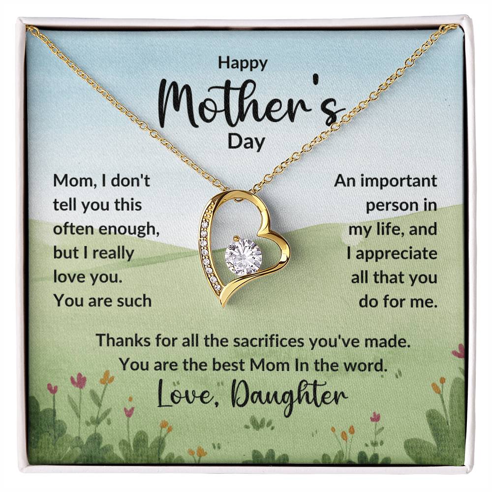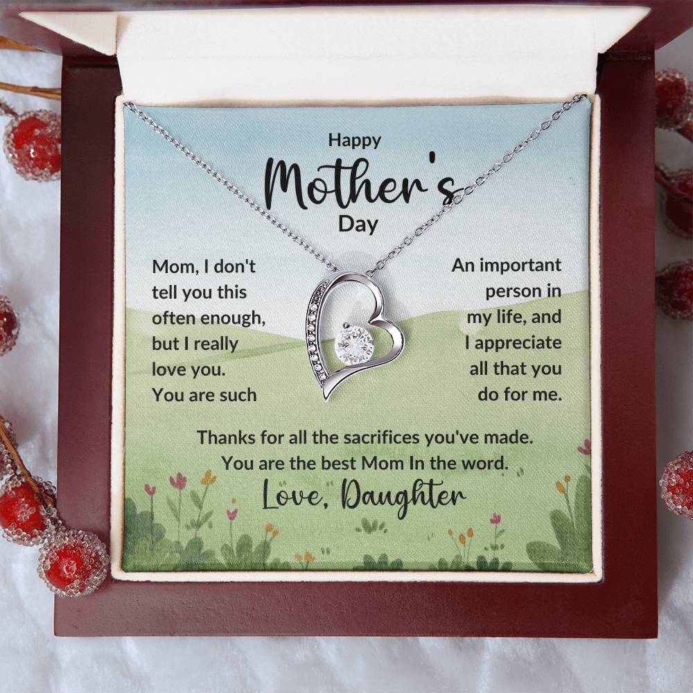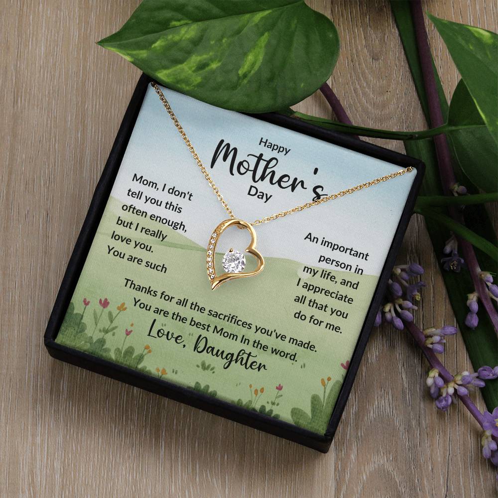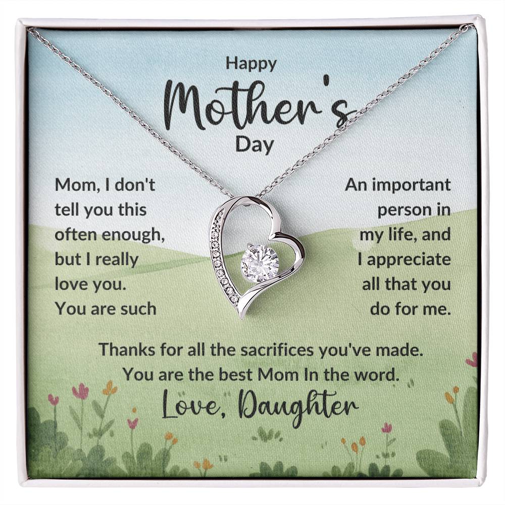 Mom, I don't tell you this often enough, but I really love you. You are such An important person in my life, and I appreciate all that you do for me. Thanks for all the sacrifices you've made. You are the best Mom In the word. Love, Daughter
