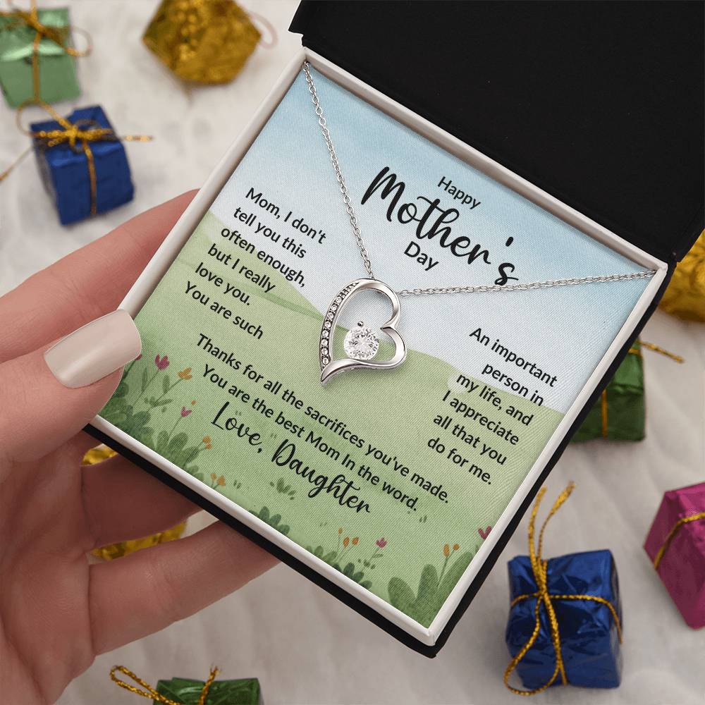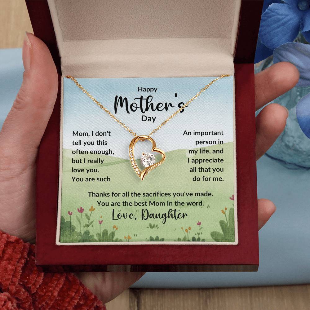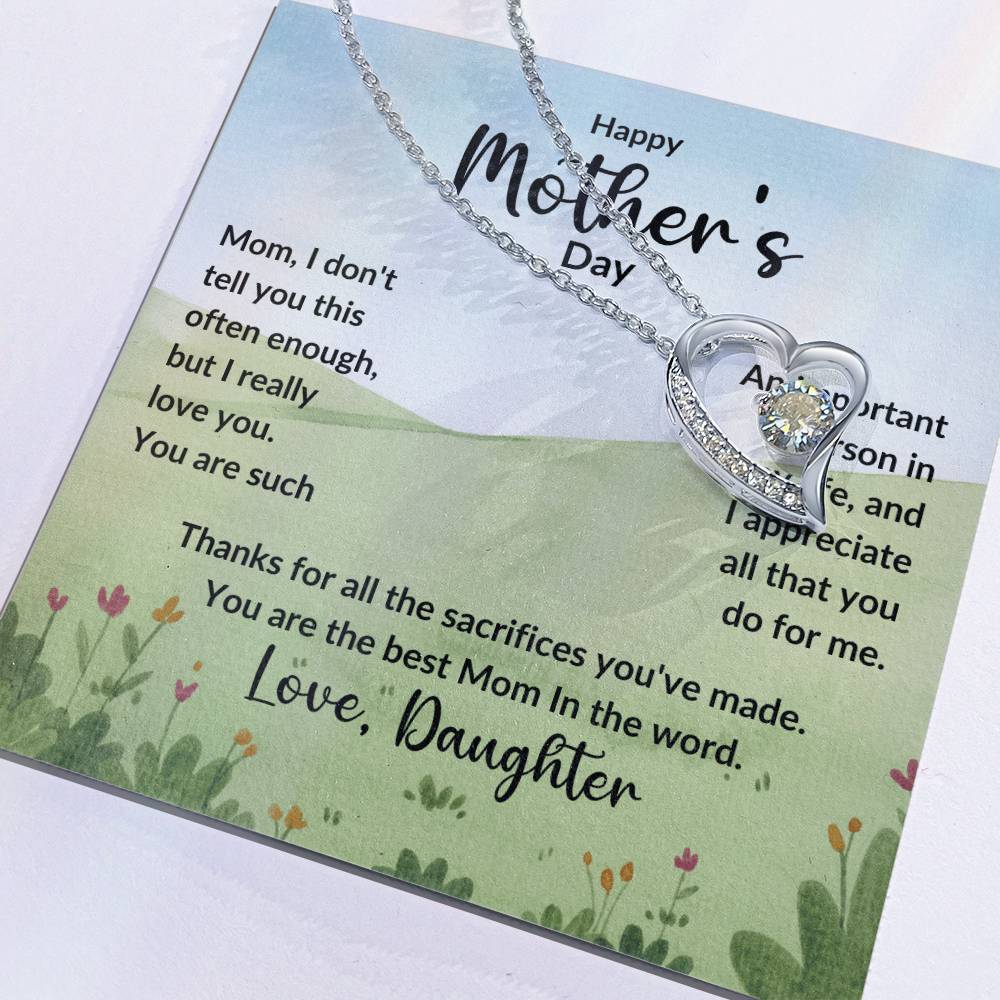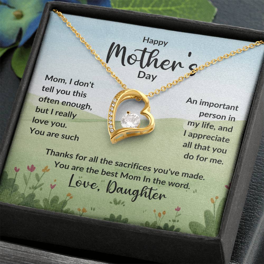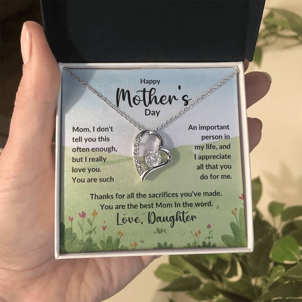 Mom, I don't tell you this often enough, but I really love you. You are such An important person in my life, and I appreciate all that you do for me. Thanks for all the sacrifices you've made. You are the best Mom In the word. Love, Daughter