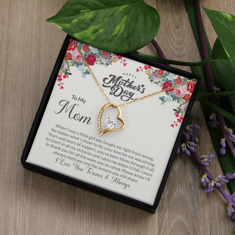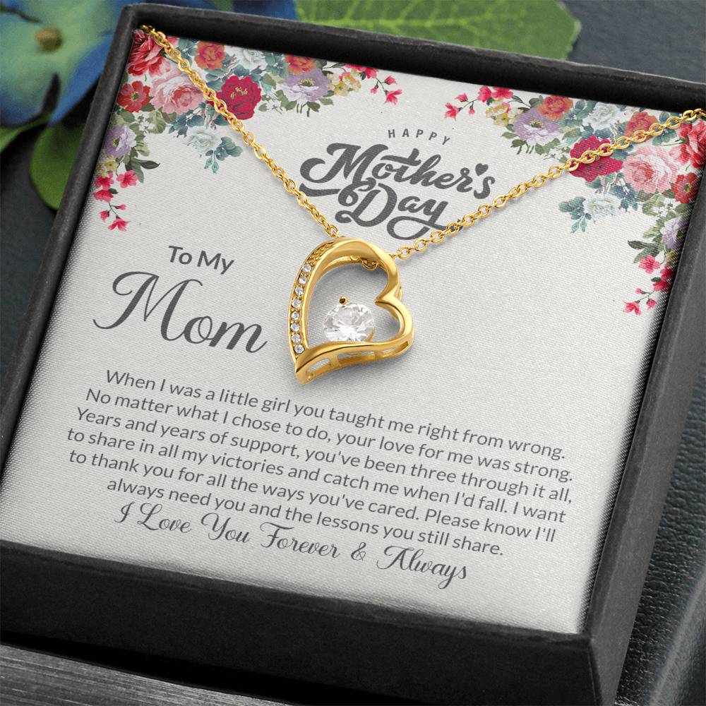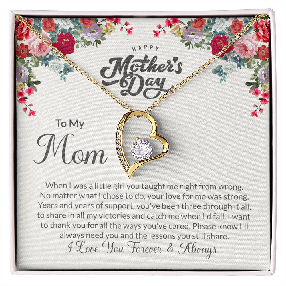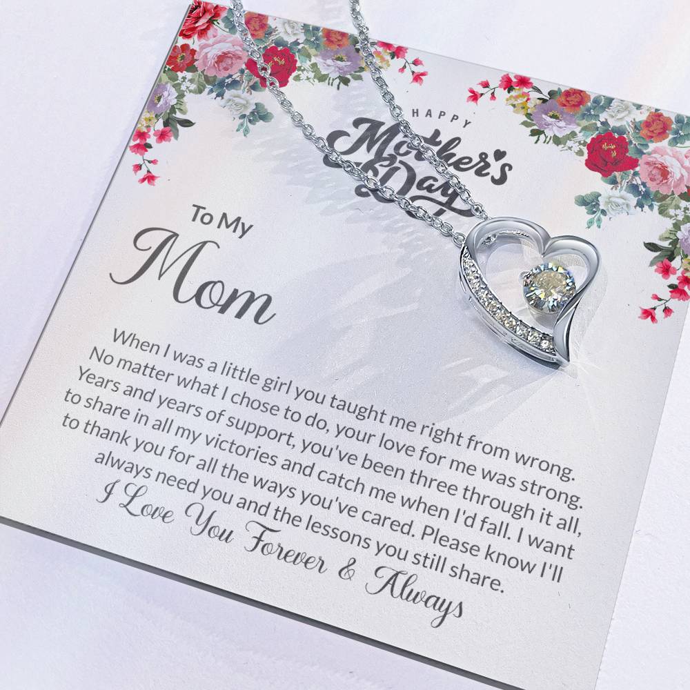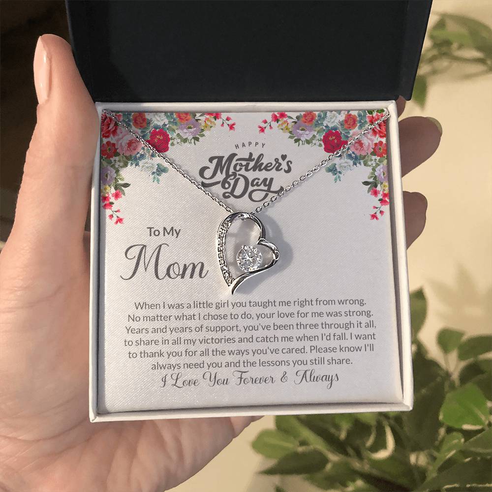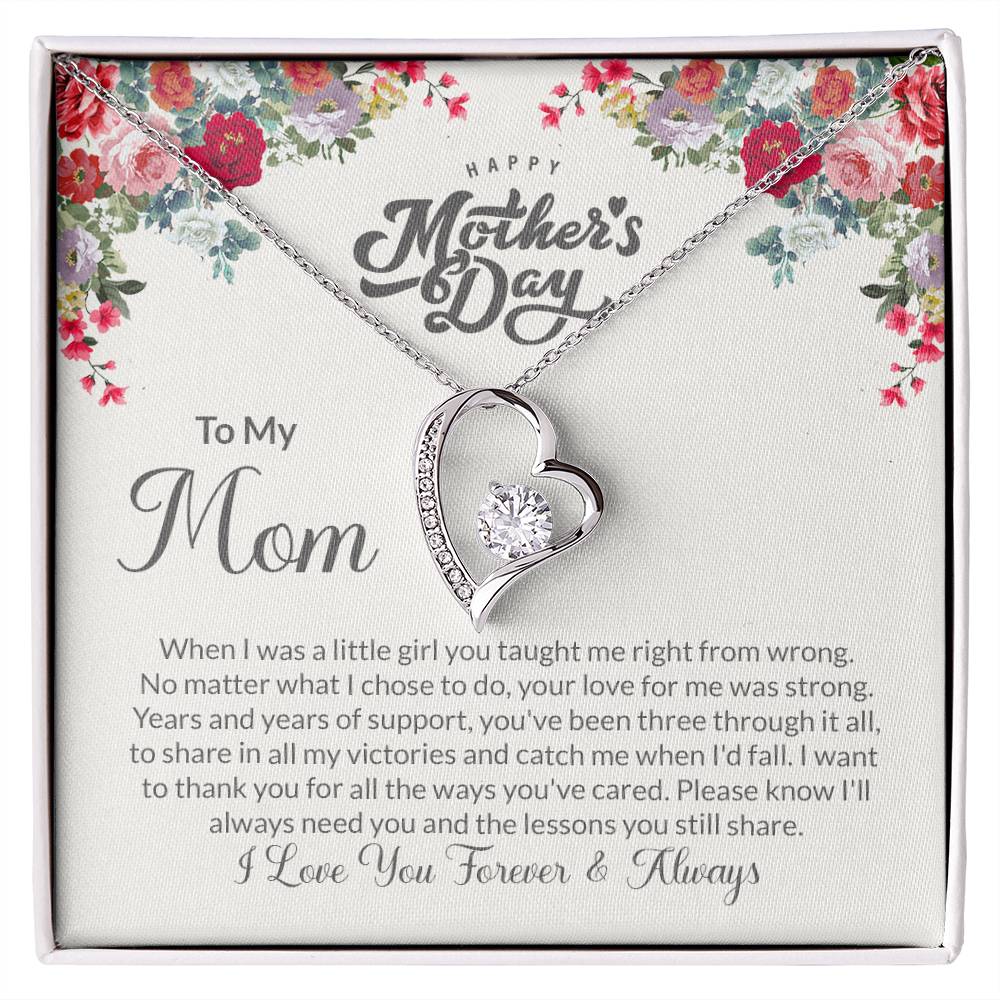 To My Mom, When I was a little girl you taught me right from wrong. No matter what I chose to do, your love for me was strong. Years and years of support, you've been three through it all, to share in all my victories and catch me when I'd fall. I want to thank you for all the ways you've cared. Please know I'll always need you and the lessons you still share.I love you forever & always