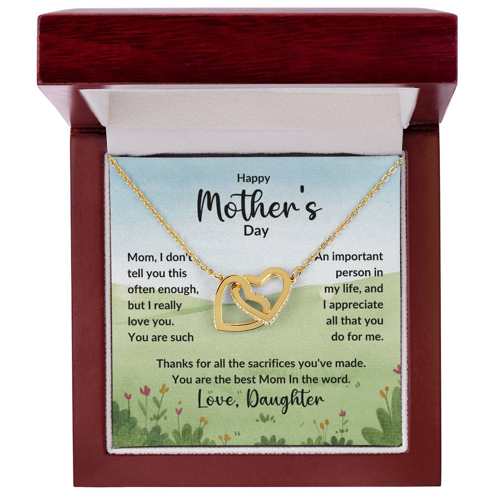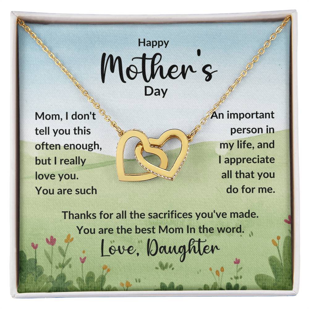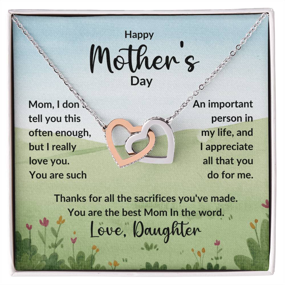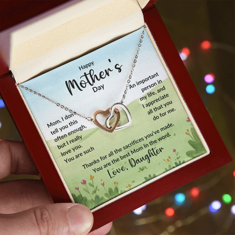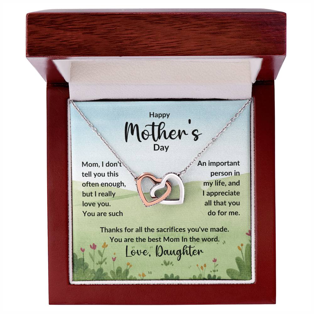 Mom, I don't tell you this often enough, but I really love you. You are such An important person in my life, and I appreciate all that you do for me. Thanks for all the sacrifices you've made. You are the best Mom In the word. Love, Daughter