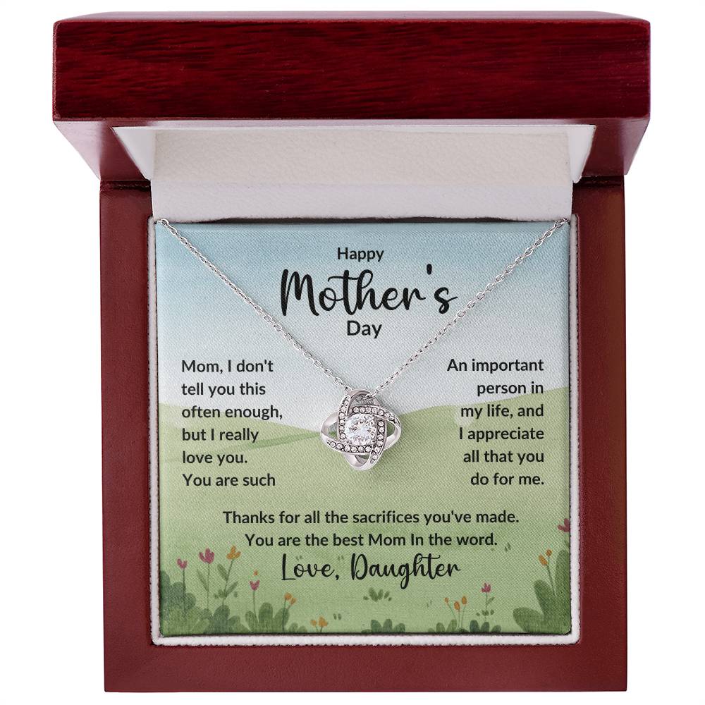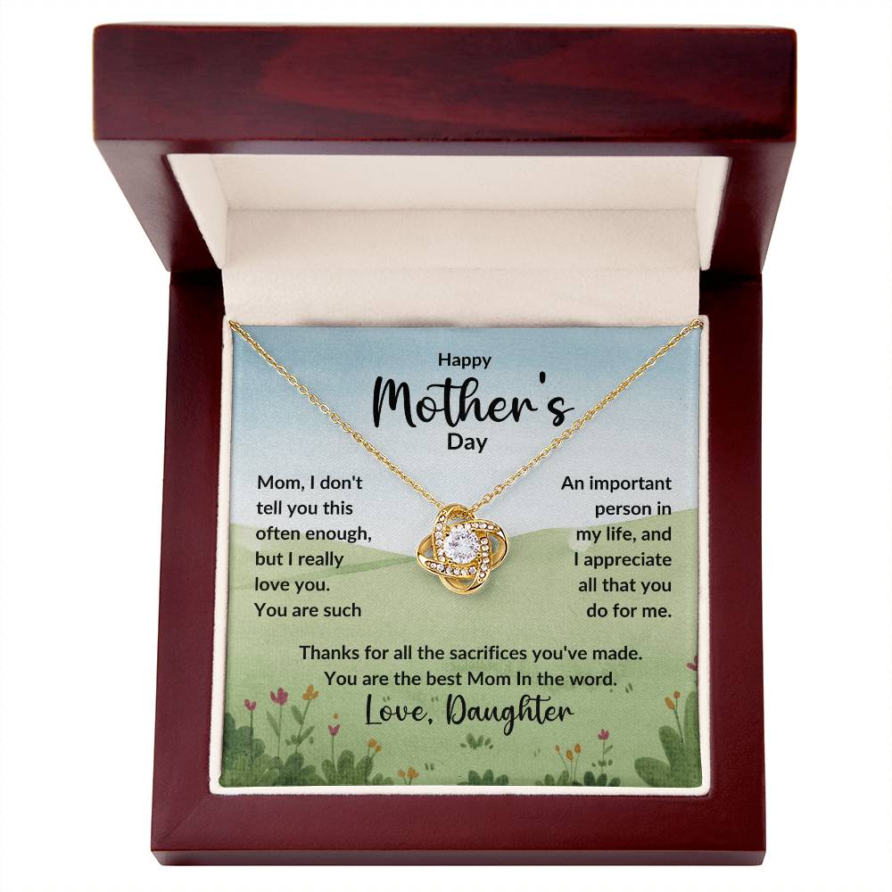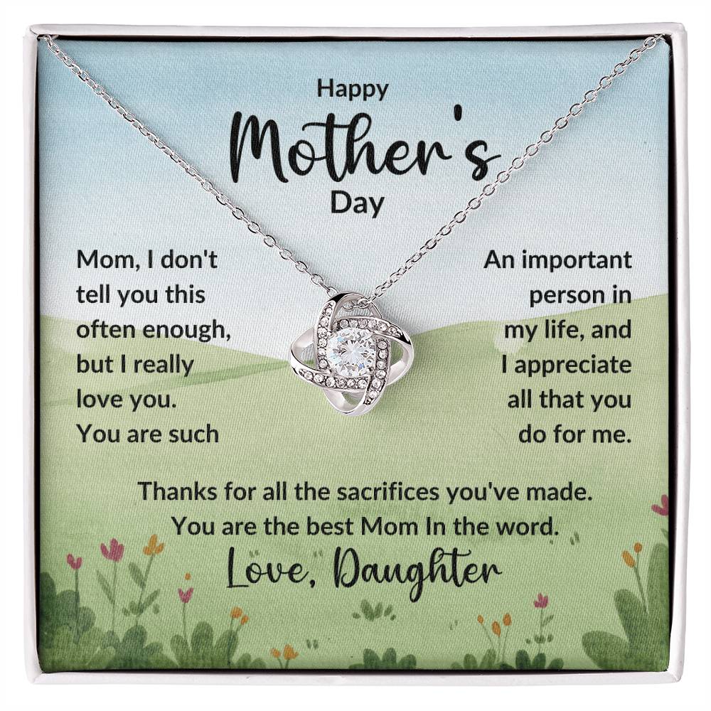 Mom, I don't tell you this often enough, but I really love you. You are such An important person in my life, and I appreciate all that you do for me. Thanks for all the sacrifices you've made. You are the best Mom In the word. Love, Daughter