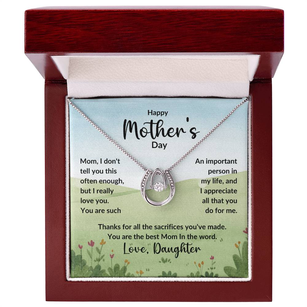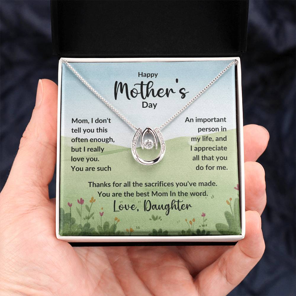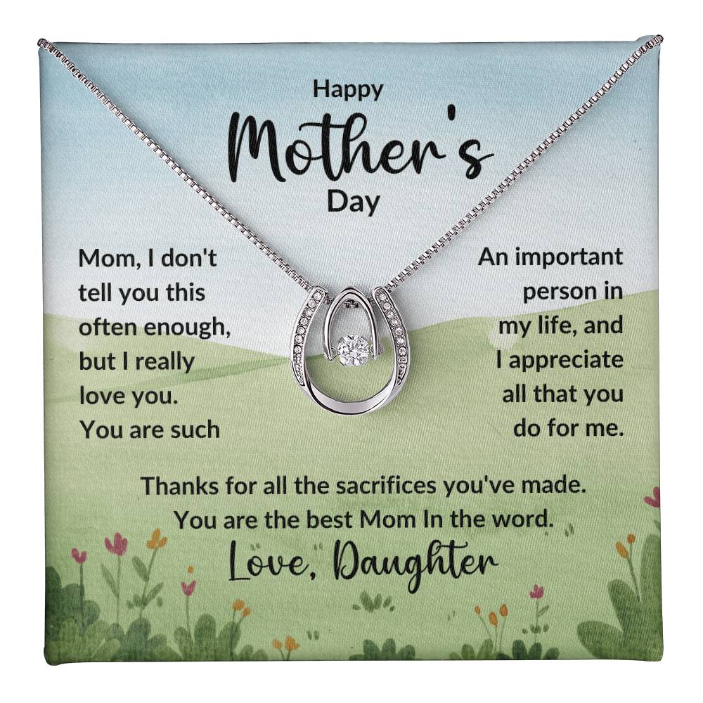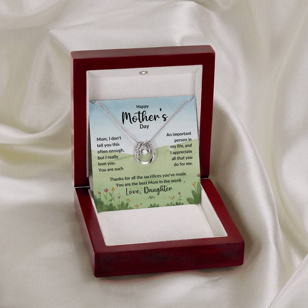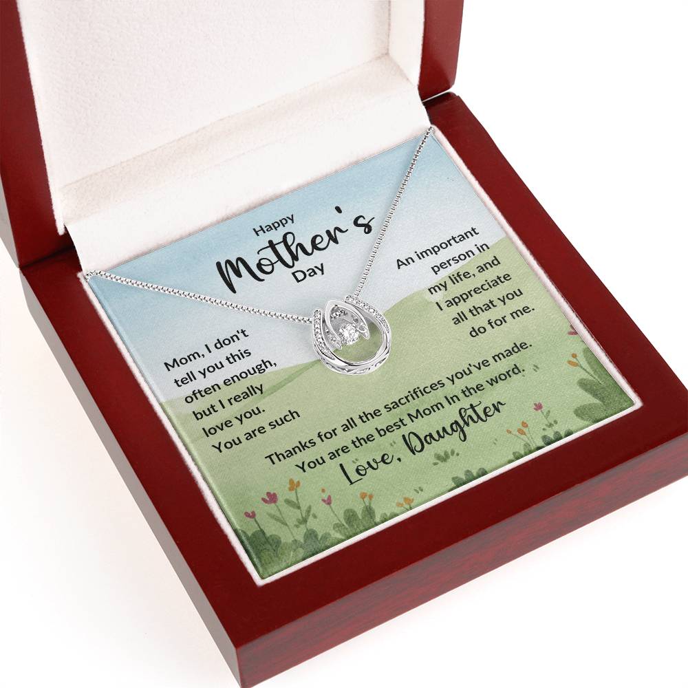 Mom, I don't tell you this often enough, but I really love you. You are such An important person in my life, and I appreciate all that you do for me. Thanks for all the sacrifices you've made. You are the best Mom In the word. Love, Daughter