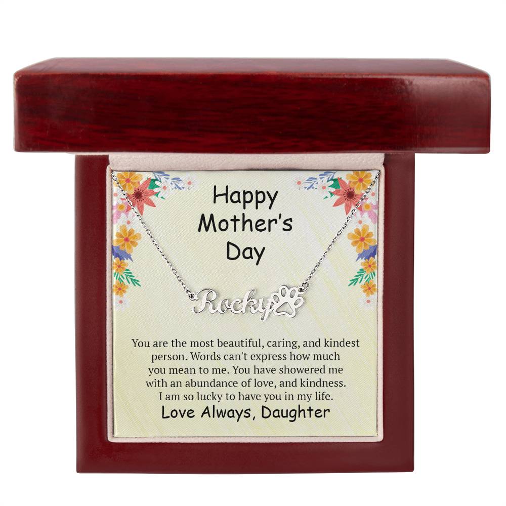This stylish necklace features a cursive name design and paw print symbol suspended on a 16”-18” adjustable cable chain, making it both personal and beautiful! Your necklace will be custom made upon ordering in the name or word of your choice, with up to 10 characters. It's a gift they will surely want to keep close to their heart forever!