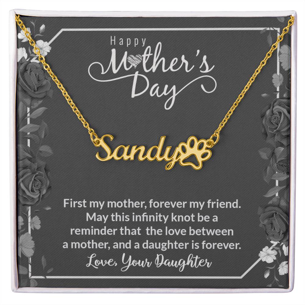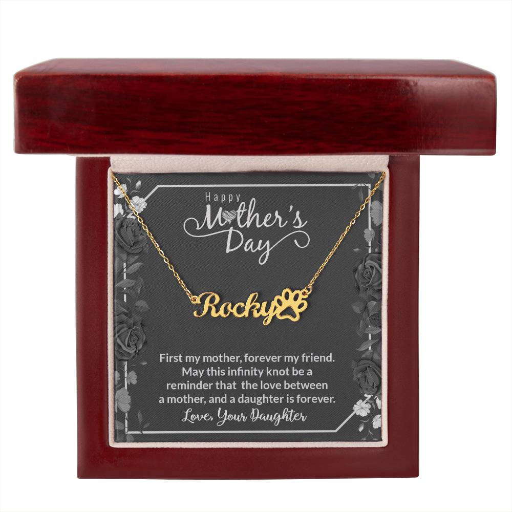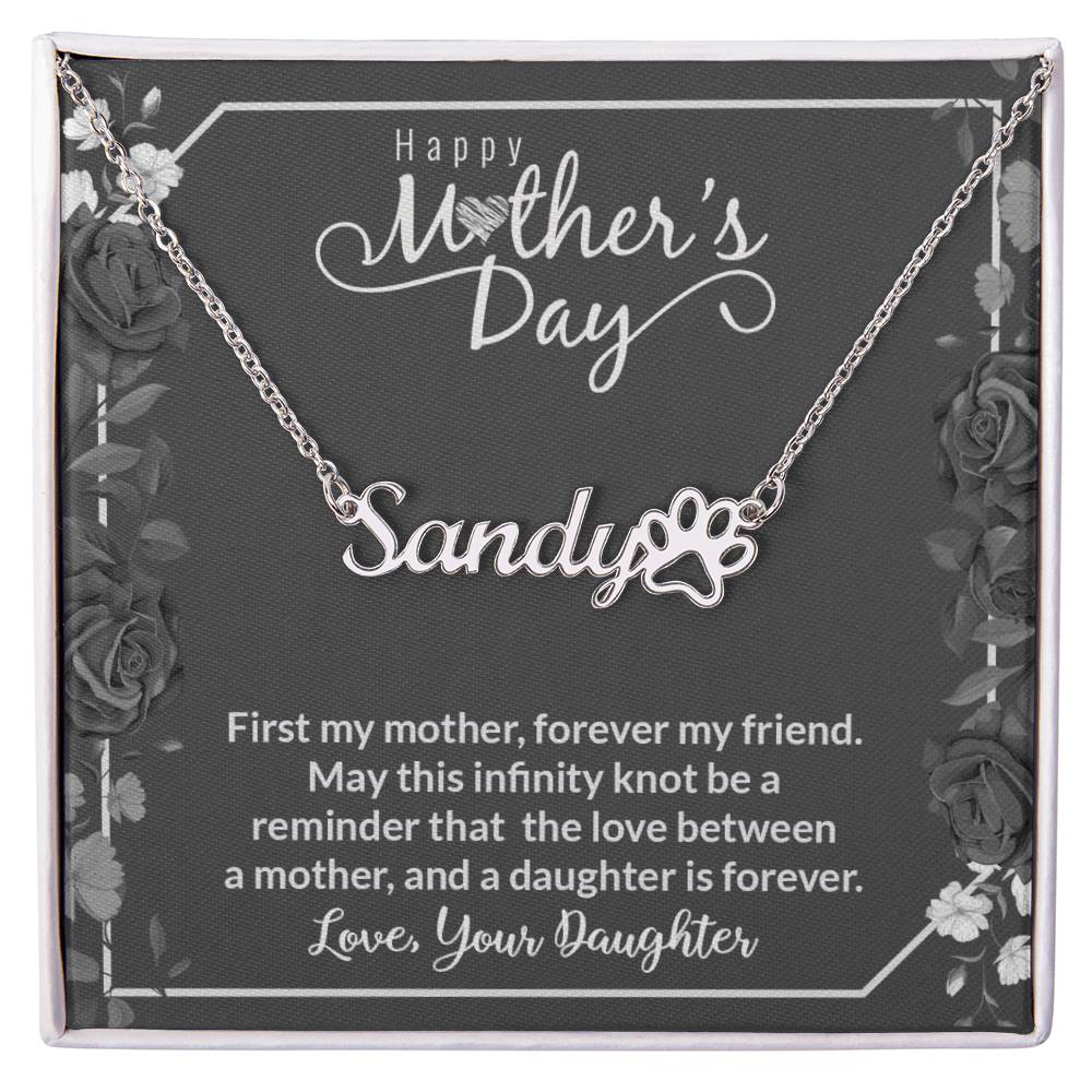 This stylish necklace features a cursive name design and paw print symbol suspended on a 16”-18” adjustable cable chain, making it both personal and beautiful! Your necklace will be custom made upon ordering in the name or word of your choice, with up to 10 characters. It's a gift they will surely want to keep close to their heart forever!