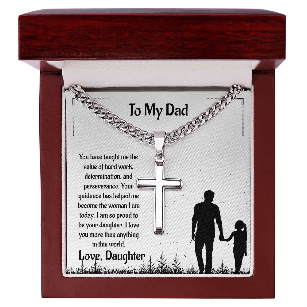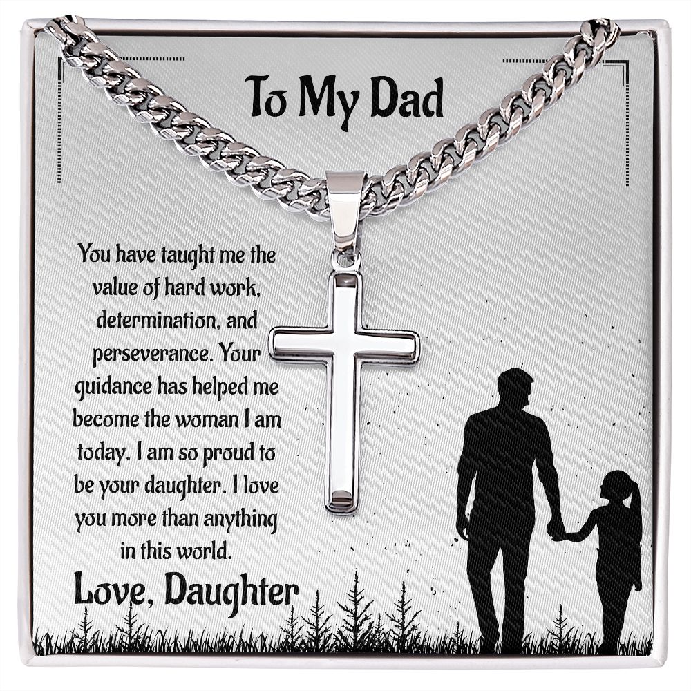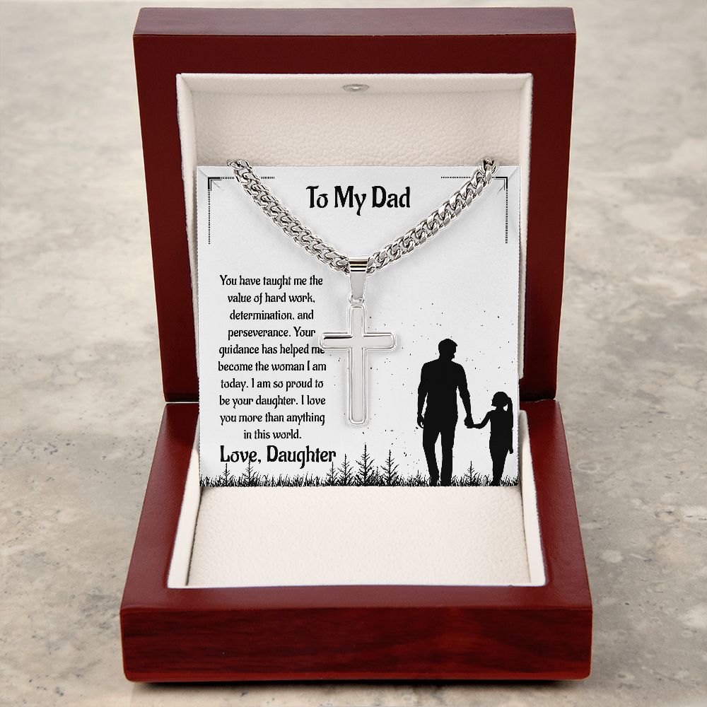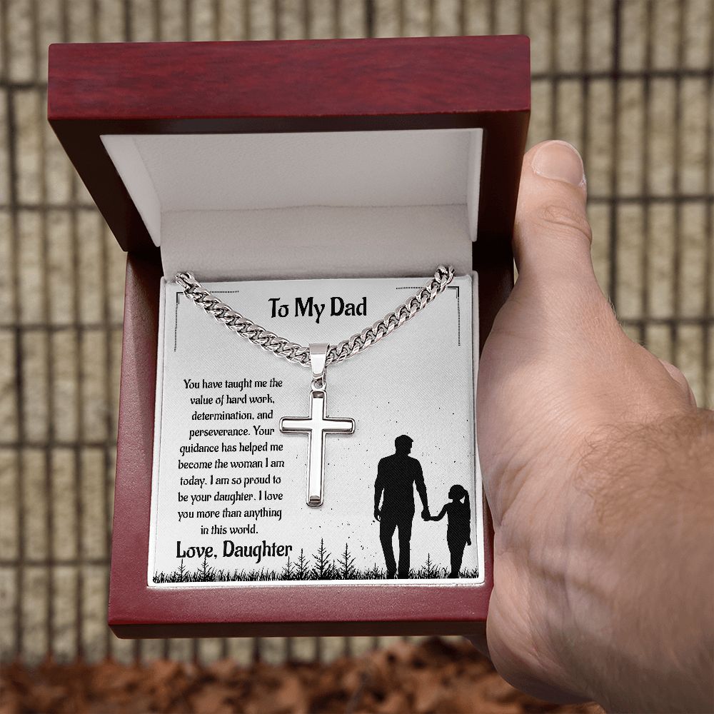 Wear your faith proudly with this Cuban Chain with Artisan Cross Necklace And Engraving on Back. Perfect for special occasions or everyday wear, this makes a wonderful gift idea for dad on Father's Day or on his birthday from her loving daughter.