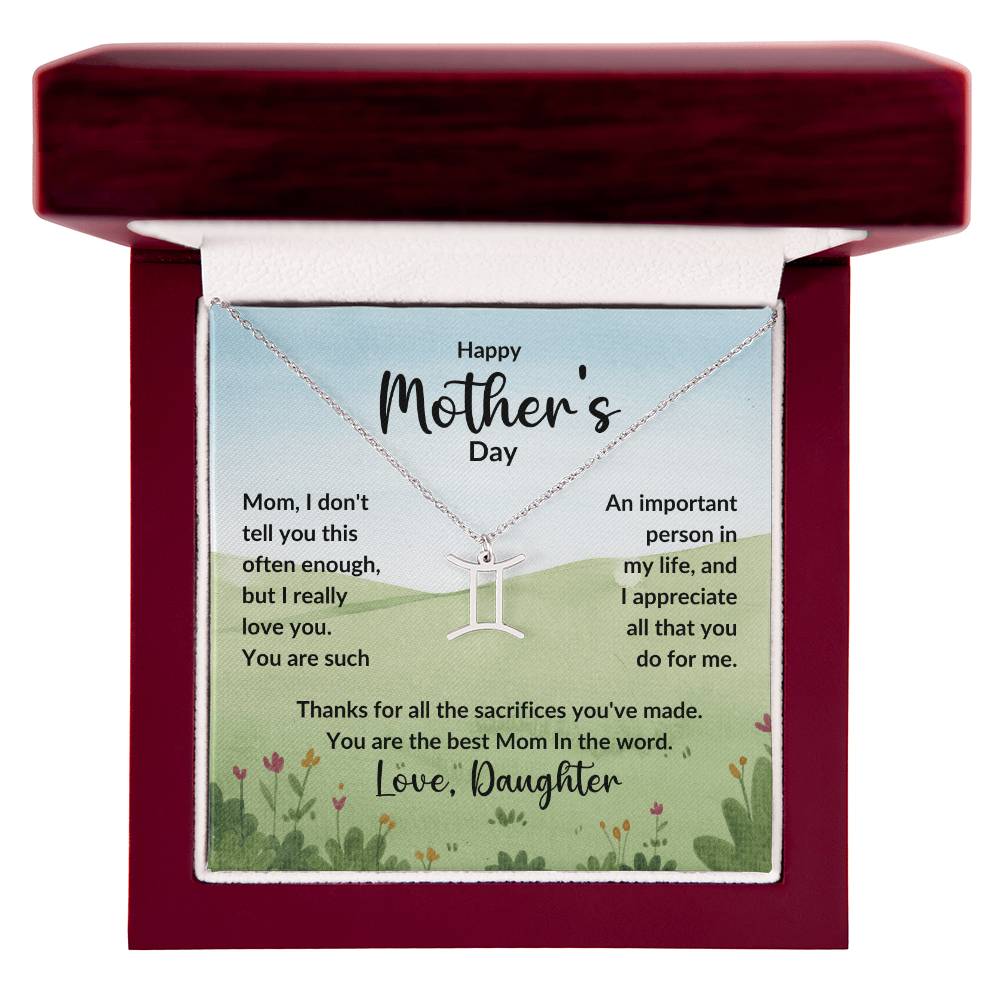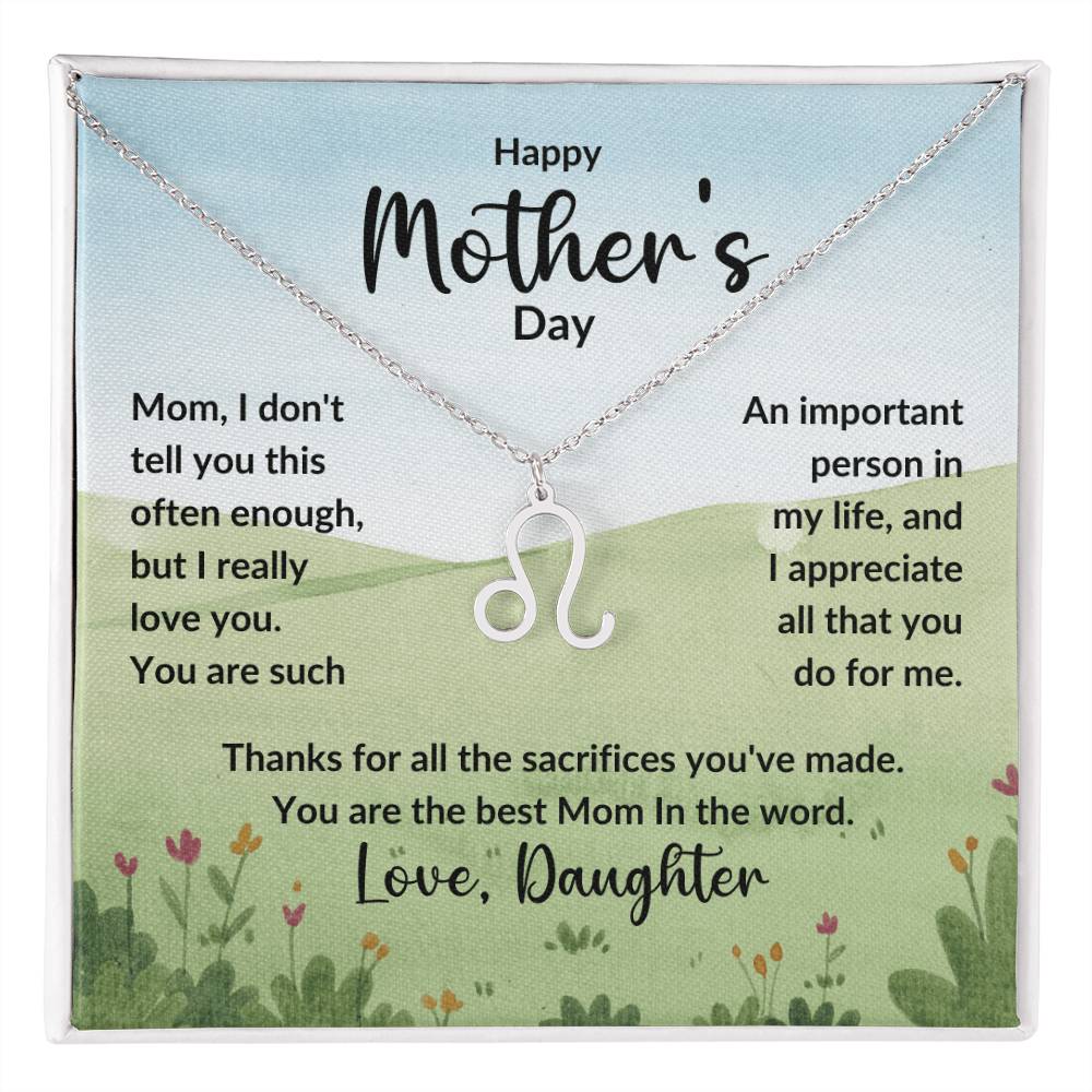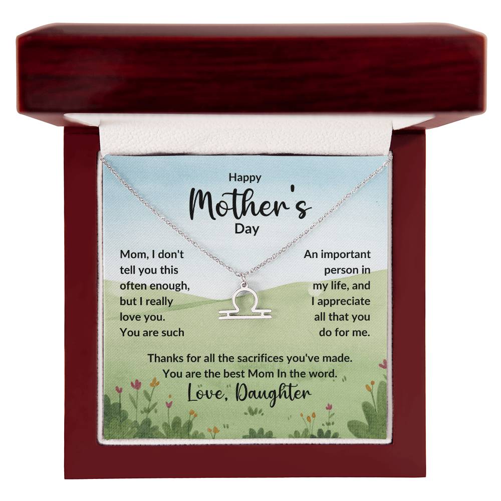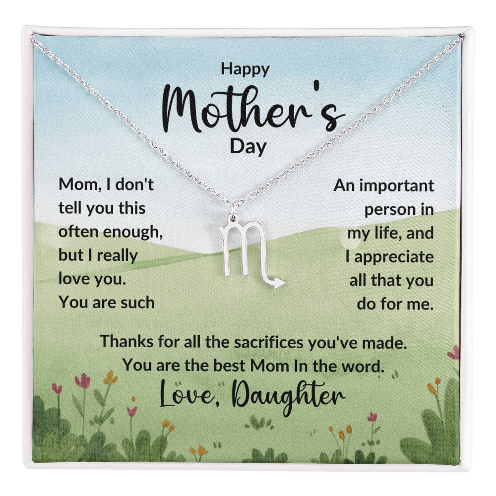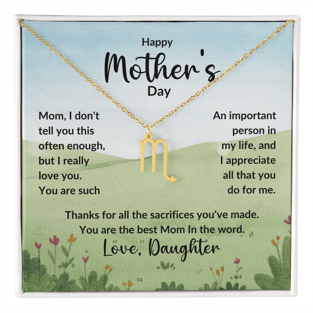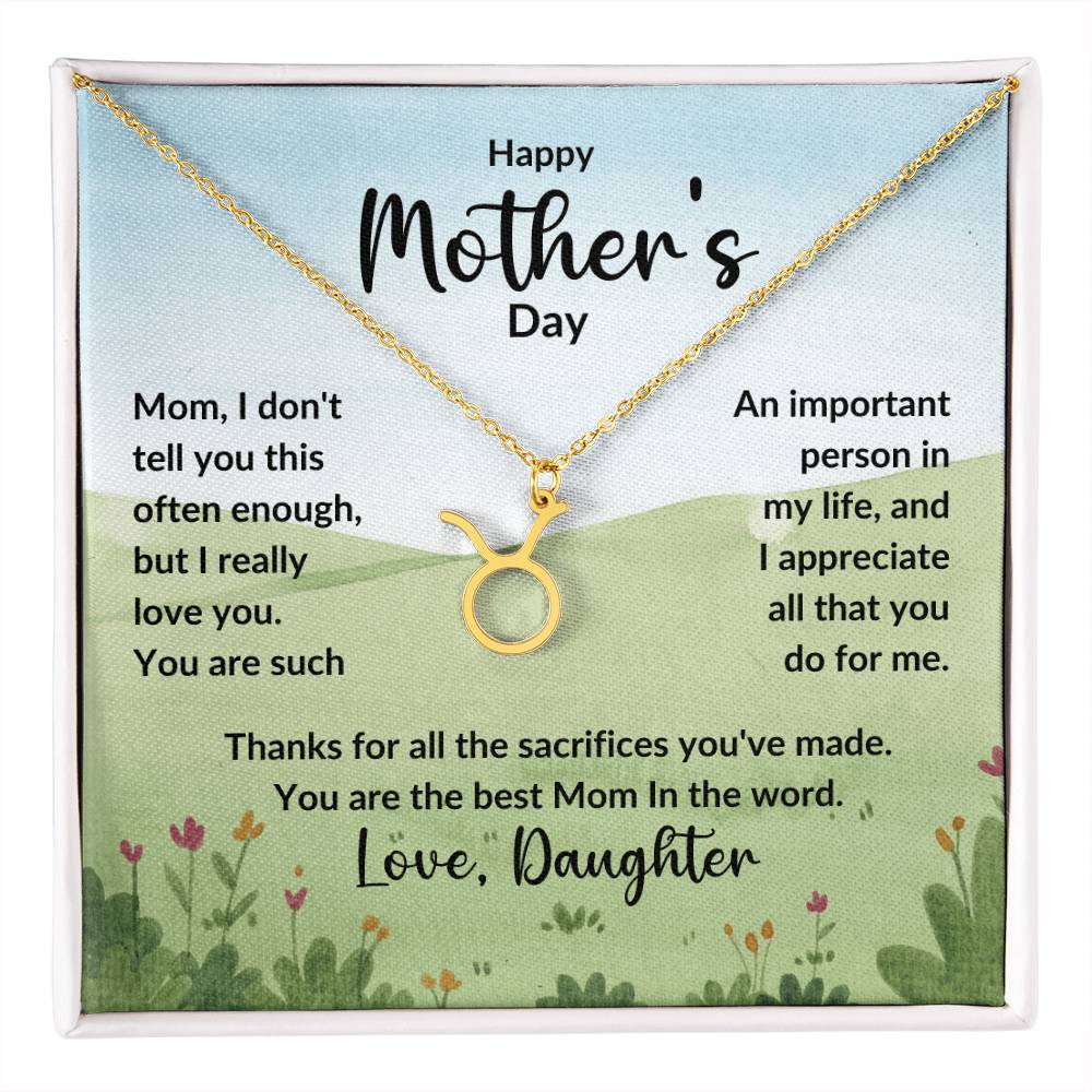 Mom, I don't tell you this often enough, but I really love you. You are such An important person in my life, and I appreciate all that you do for me. Thanks for all the sacrifices you've made. You are the best Mom In the word. Love, Daughter